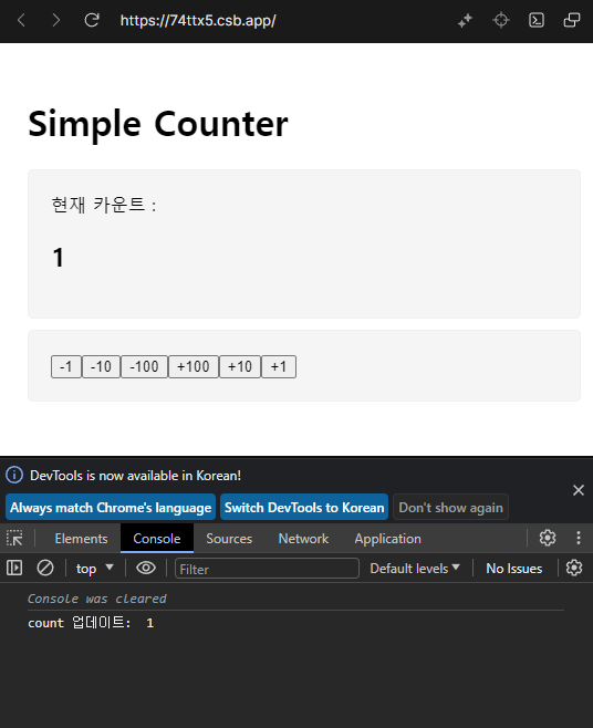 위 소스와 결과물을 보면 useEffect를 선언하면서 첫번째 콜백 실행 함수로 console을 찍도록 하고 두번째 인수로 count라는 맨위에 useState로 선언한 변수를 의존성 배열로 넣어서 감시한다 즉, count가 업데이트되면 console을 찍게된다